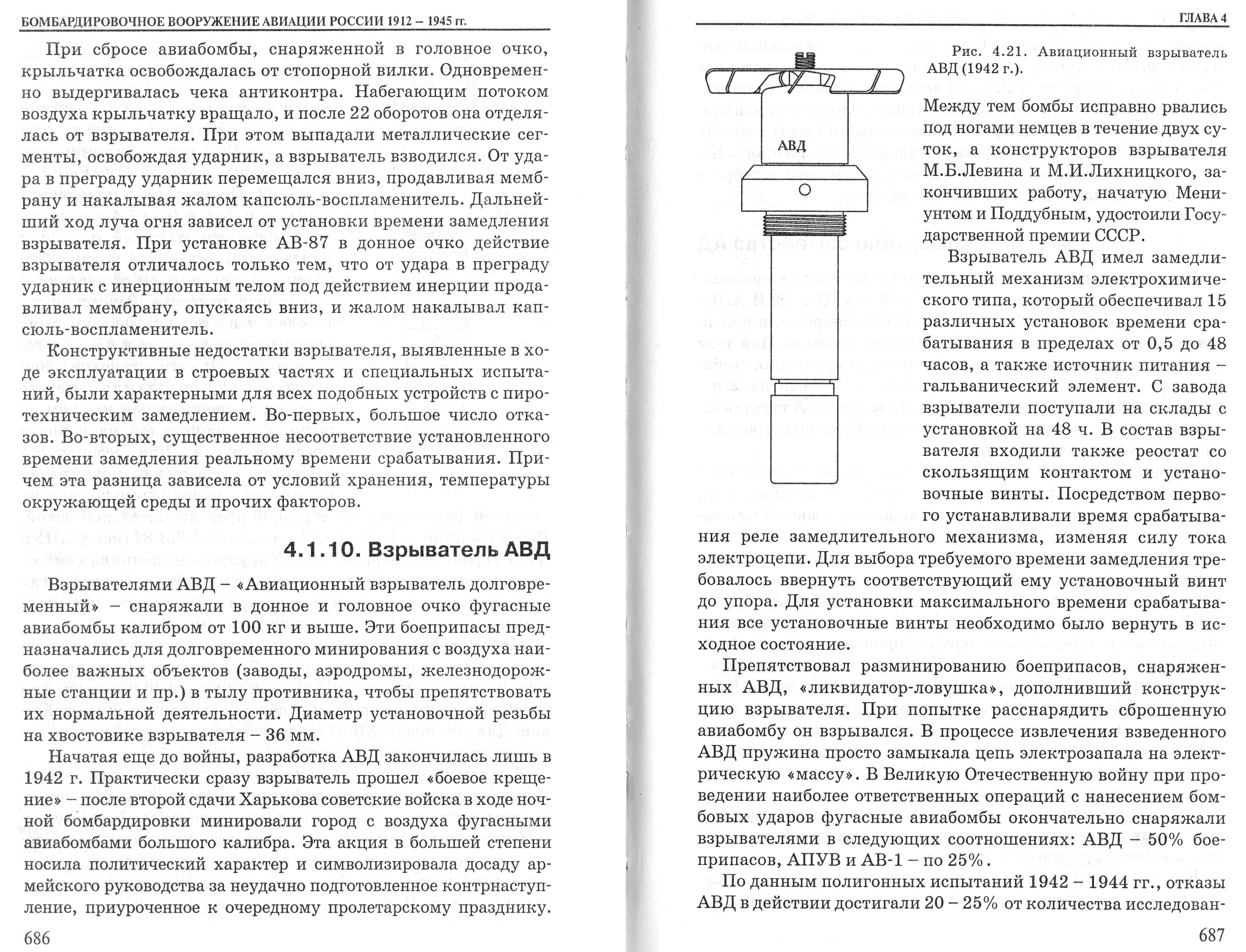 8. АВ-4 "Авиационный взрыватель четвёртой модели". Для снаряжения в головное очко осколочных бомб и бомб вспомогательного назначения. Минимальная высота сброса - 100м по земной и 600м о водной поверхности. Мгновенное действие или замедление 0.1 сек.