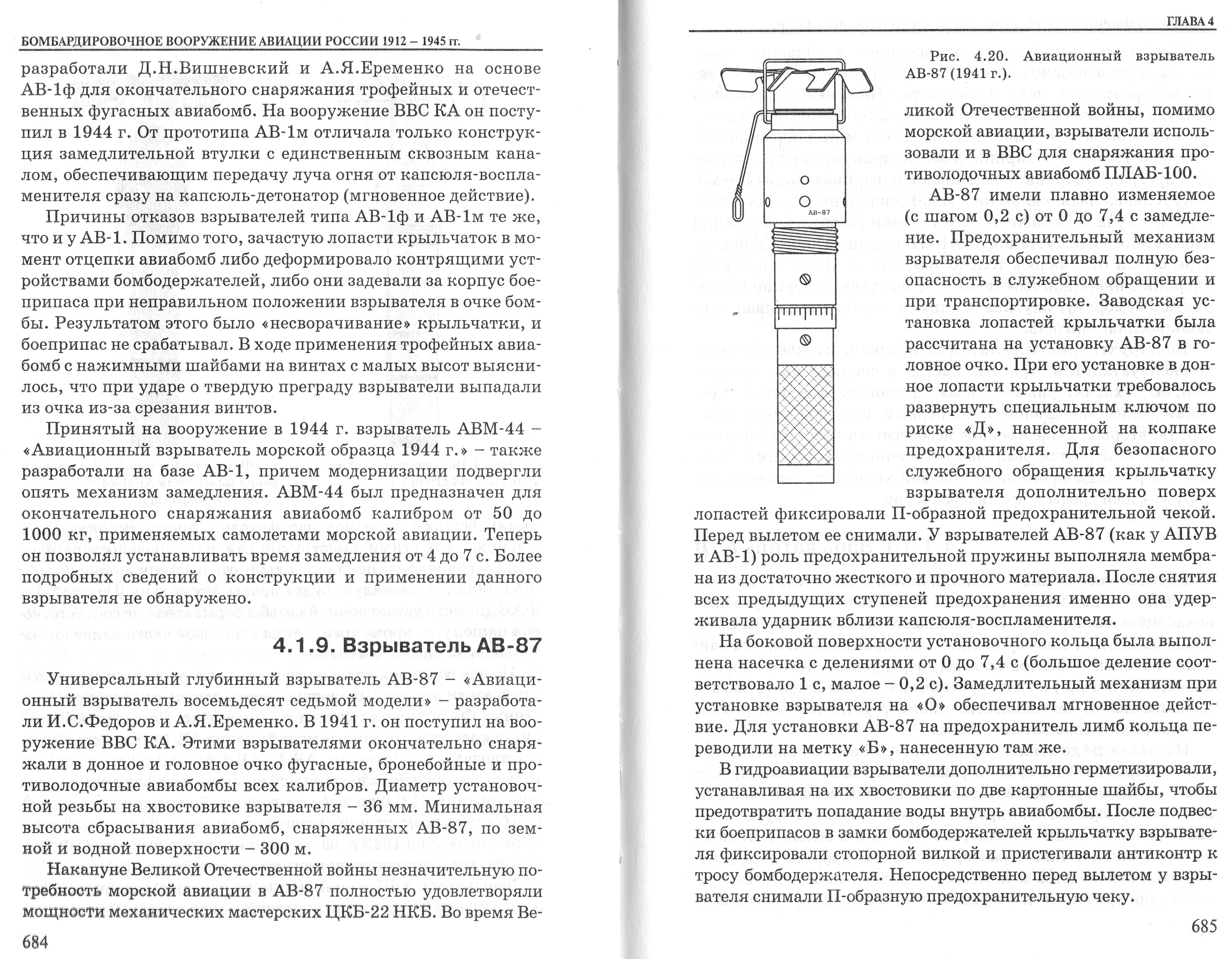 8. АВ-4 "Авиационный взрыватель четвёртой модели". Для снаряжения в головное очко осколочных бомб и бомб вспомогательного назначения. Минимальная высота сброса - 100м по земной и 600м о водной поверхности. Мгновенное действие или замедление 0.1 сек.