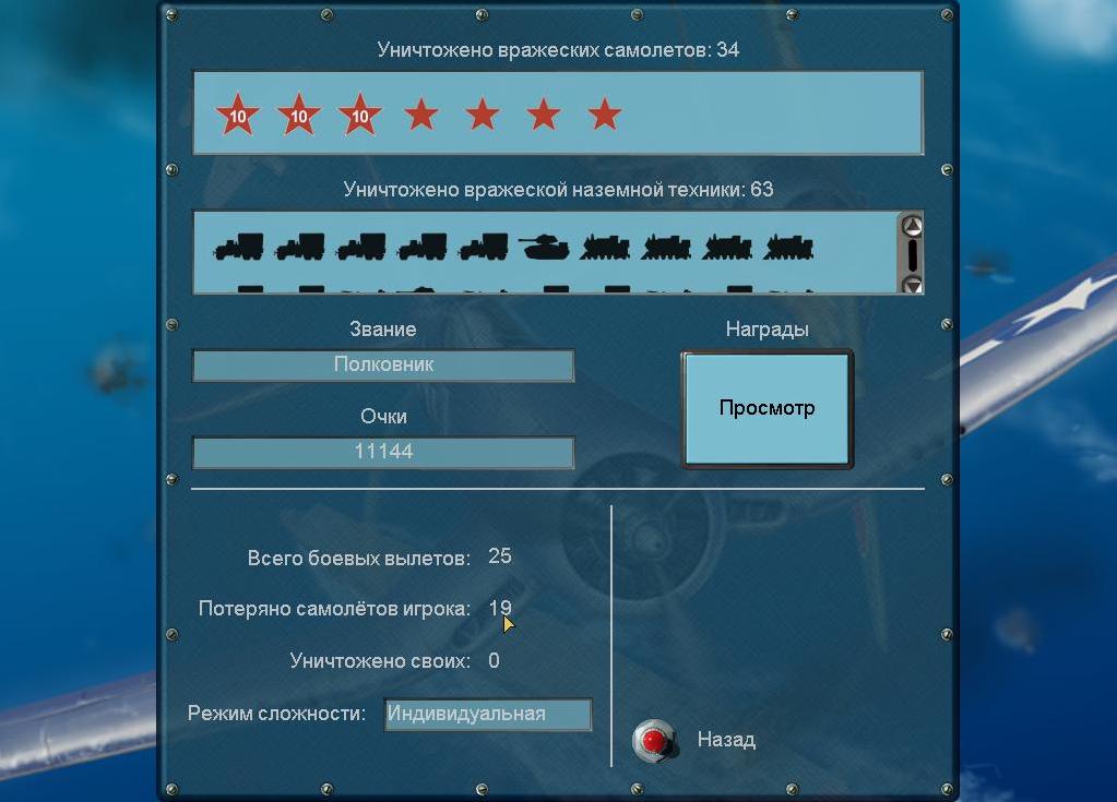 Итог кампании у меня получился впечатляющий. Сбил 20 самолётов, правда как падали, взрывались, разваливались видел только 12. С наземкой не густо получилось, только один кораблик и 21 машина. И самого два раза подбивали на севере, один раз на пузо сел, второй пришлось прыгать.
