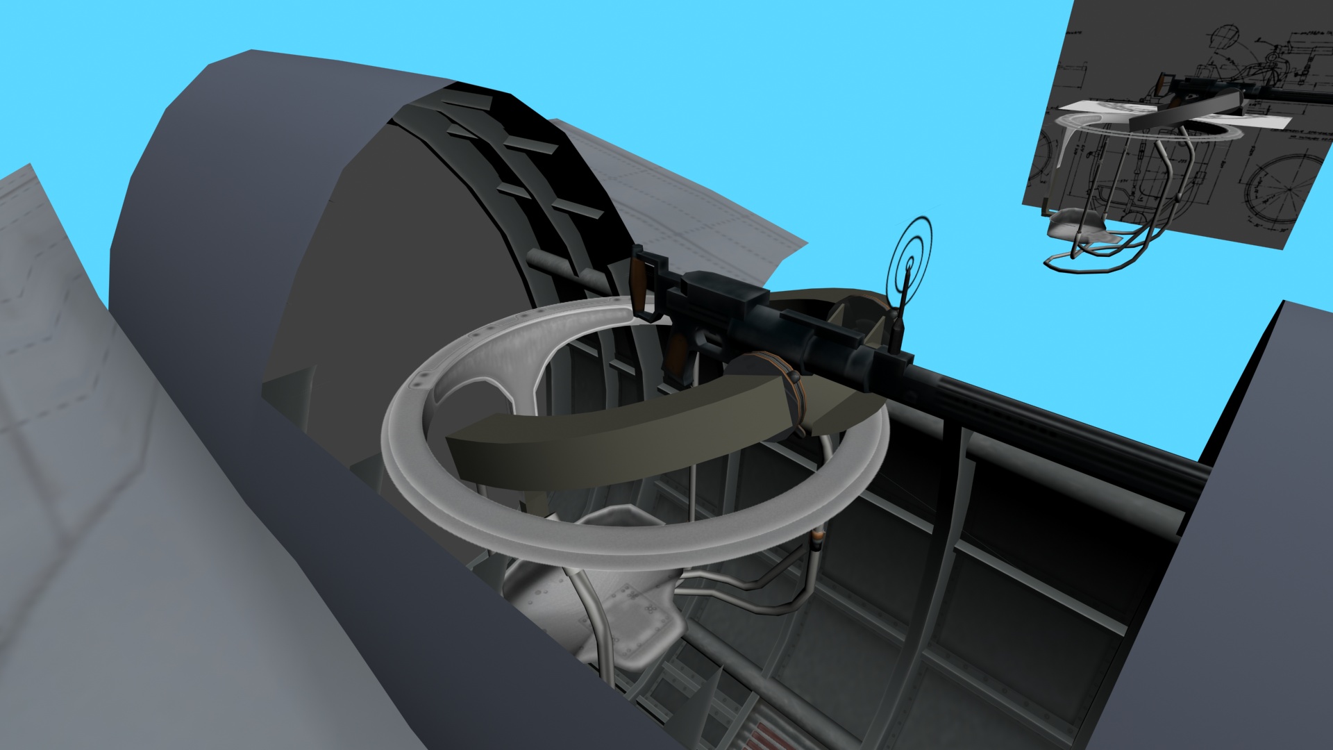 ![]() Дуги на которых пулемет крепился были со скругленными фасками - неплохо бы замоделить. Заметная деталь. На той дуге, где проходила лента можно сделать (альфой) окошки а под ними положить плашки с нарисованными патронами - когда патроны будут кончаться - их можно анимировать (сдвинуть), типа конец ленты уполз. |