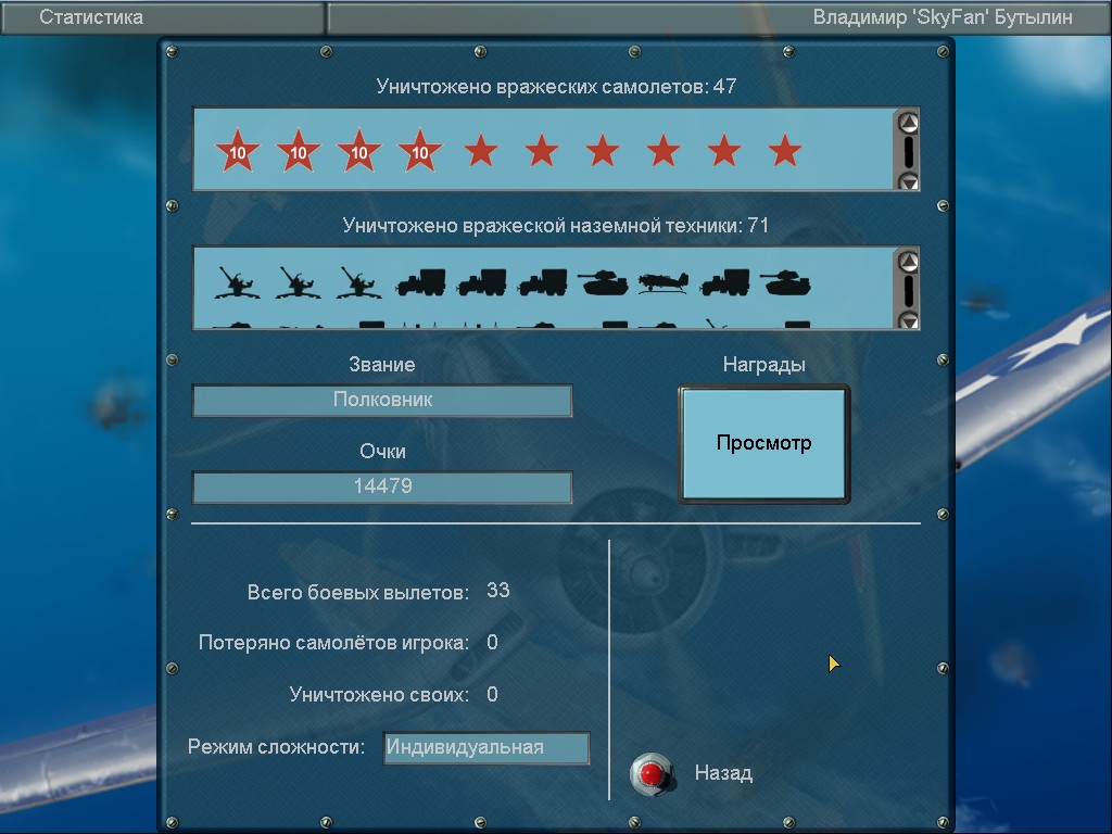 Итог - майор, Герой, 25 сбитых и 42 наземки. Хотя вообще-то на редкость плохо отлетал - 6 самолетов потеряно. Как я обычно делаю - итог делю на количество потерянных))), и получается грустно... Но потери, если честно, 4 глупые. Особенно достали последние две. В одной из последних заполярных миссий подорвался, похоже, на собственных бомбах при атаке БДБ. А в последней миссии вообще позорно - никак не могу понять логики бомб в 4.10... То сброс с малой высоты - они не взрываются.. Тут, указание о сбросе на невзрыв - после взлета иду над водой, сбрасываю с малой высоты - и меня разносит на кусочки именно взрывами... Не понял, за что. В целому кампания удалась! Как всегда! Заключительный ролик просто шедевральный - трогает. Любопытно понять, как сняли... |