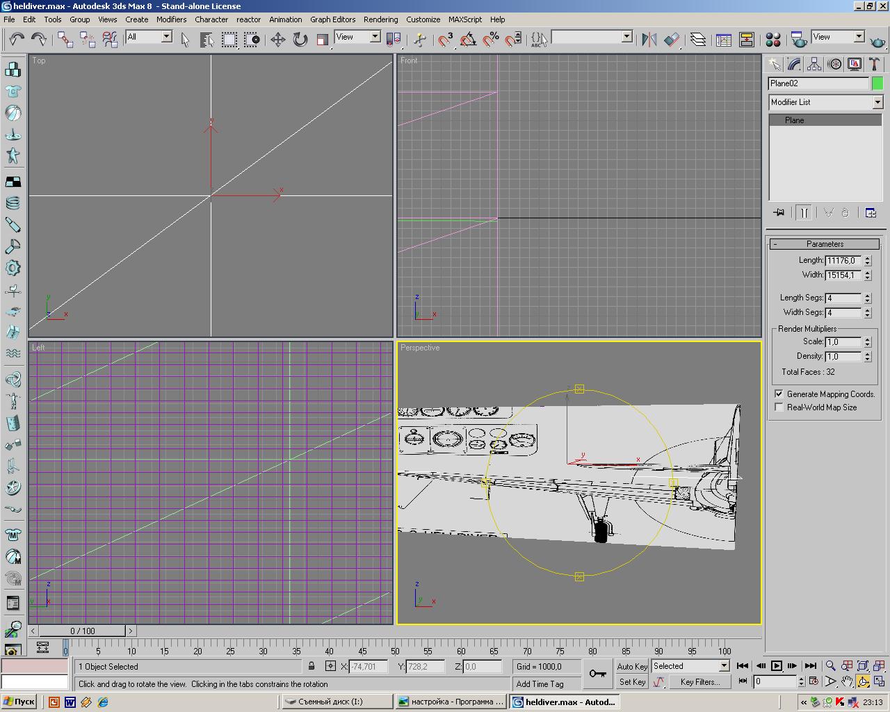 Я делаю так: 1)Создаем квадратную картинку любого удобного размера. 2)режем исходный чертеж на вид слева/справа, сверху, спереди/сзади. 3)Тех квадратных картинок создаем столько, сколько проекций. 4)В фотошопе, или другой аналогичной программе, совмещаем изображения так, чтобы на всех видах центр их осей был одинаково расположен в центре квадратных картинок. 5) сохраняем все виды, а для удобства делаем их фон не белым, а светло-серым. 6)В максе, делаем активным окно проекции, идем в Views-->Viewport Background, выбираем там соответсвующую картинку, ставим галку Match Bitmap, Lock Zoom/Pan. Кстати весь процесс описан в Help-->tutorials... Там как раз про моделирование самолета. Там написано (если дружите с языком Байрона и Шекспира ) как подогнать картинки по размеру. То есть, делаем бокс, пишем ему максимальные размеры самолета, и по нему все картинки приводим. Если надо, могу наглядно пояснить суть метода. Удачи! П.С. выглядит в конце все так как на картинке: