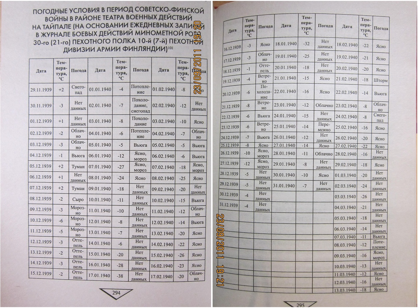 Думаю, всем создающим миссии-кампании про "зимнюю войну" будет небезинтересно ознакомиться вот с этой таблицей, на которую я только что наткнулся перелистывая книгу К.В. Якимовича "На фланге линии Маннергейма. Битва за Тайпале". Полагаю, ввиду небольших размеров Карельского перешейка, погода на нём всём была примерно такой же.