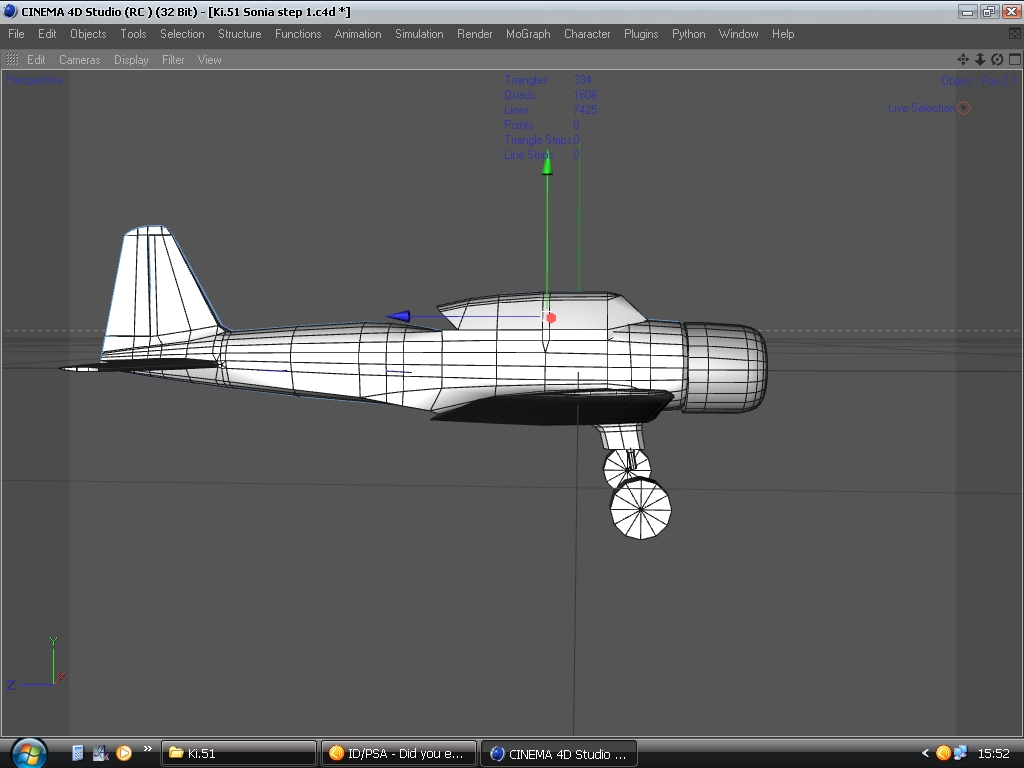 Сейчас делаю лапти шасси и элементы крыла, скрины через несколько часов покажу. Все элементы конструкции существуют в рамках одного тела, т.к. на текущем этапе я хочу максимально использовать возможности одного меша, экструдируя, клонируя точки и соединяя их в полигоны.... позже по общей готовности я буду откреплять требуемые части в отдельные тела - отстыкую крыло от центроплана, рули и сдвижные части фонаря, створки радиатора станут самостоятельными объектами с перестановкой в нужные места и под нужным углом осей для вращения или перемещения... Работа с одним мешем позволяет сделать идеальную стыковку частей и иметь минимальное число полигонов без "засунутых вовнутрь" кусков конструкции, исключение тут - передняя часть фонаря. Конструкция все время подвергается мелким правкам, в т.ч. кромка руля высоты и пр. Мой глазомер устроен таким образом, что мне легче сверять пропорции по мере наращивания общей готовности, поэтому я периодически возвращаюсь к уже сделанным элементам и правлю их. Общий вес модели на текущий момент составляет 644 полигона и 674 точки, треугольников практически везде по 2 на полигон, т.е. классическое разбиение, т.к. я стараюсь перепрошивать полигоны вручную во избежание лишних тругольников. Труднее всего было сделать корневой наплыв крыла - там сильный перекос полигонов, что вообще-то нежелательно, но поскольку затенение в игре не "подсвечивает" такие перекосы да и вообще угловатость не видна, то особой проблемы это не представляет. Все, пошел работать далее...