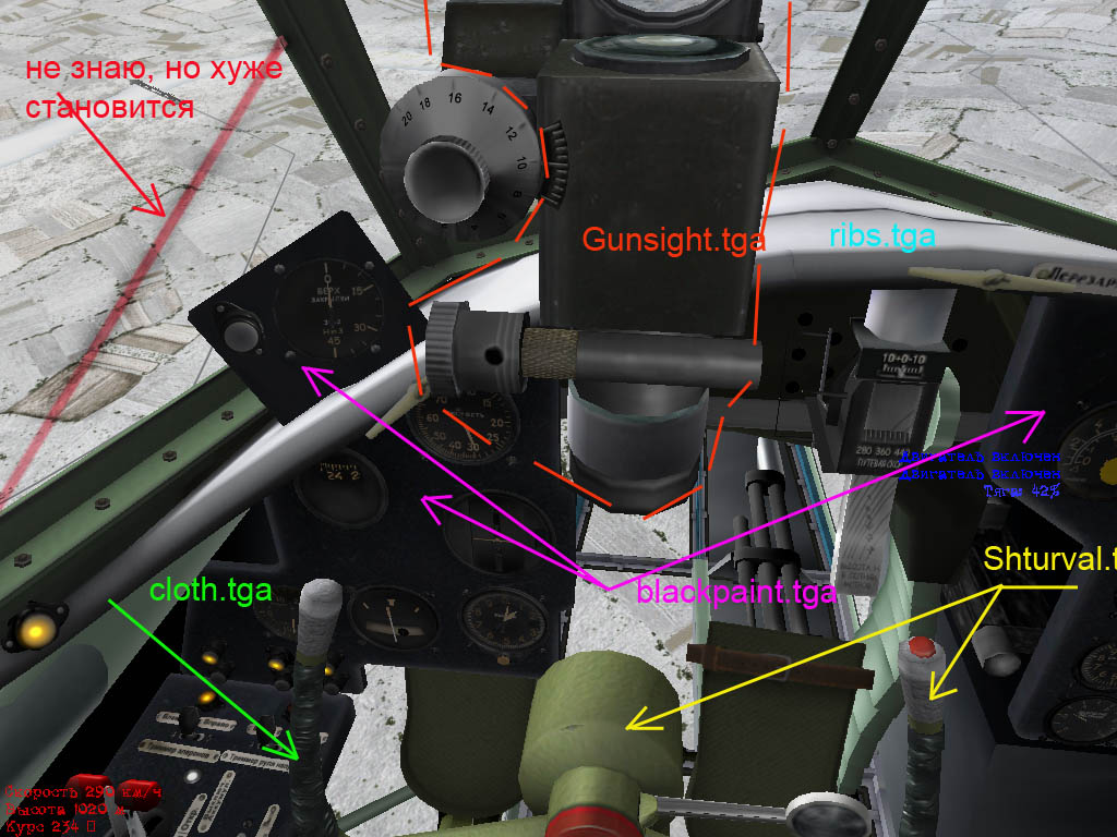 Пока разбираюсь в устройстве текстурирования кокпита. Взял в дополнение к дефолтным текстурам ( приборы и многое другое классные, хотя им лет уже 7-8) +подручные материалы из кокпитов Мангаса, Грифа и Гоши. Практически нигде не попал, зато хоть понял, что и как ложится из текстур. Дефолтные текстуры вскоре вышлю. Практически нам необходимо только эти. На картинках я их указал. Тренируюсь на Пе-3 |
