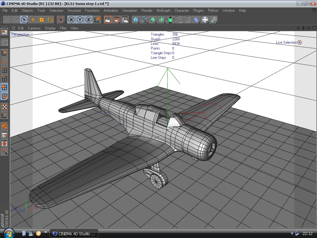 Сейчас делаю лапти шасси и элементы крыла, скрины через несколько часов покажу. Все элементы конструкции существуют в рамках одного тела, т.к. на текущем этапе я хочу максимально использовать возможности одного меша, экструдируя, клонируя точки и соединяя их в полигоны.... позже по общей готовности я буду откреплять требуемые части в отдельные тела - отстыкую крыло от центроплана, рули и сдвижные части фонаря, створки радиатора станут самостоятельными объектами с перестановкой в нужные места и под нужным углом осей для вращения или перемещения... Работа с одним мешем позволяет сделать идеальную стыковку частей и иметь минимальное число полигонов без "засунутых вовнутрь" кусков конструкции, исключение тут - передняя часть фонаря. Конструкция все время подвергается мелким правкам, в т.ч. кромка руля высоты и пр. Мой глазомер устроен таким образом, что мне легче сверять пропорции по мере наращивания общей готовности, поэтому я периодически возвращаюсь к уже сделанным элементам и правлю их. Общий вес модели на текущий момент составляет 644 полигона и 674 точки, треугольников практически везде по 2 на полигон, т.е. классическое разбиение, т.к. я стараюсь перепрошивать полигоны вручную во избежание лишних тругольников. Труднее всего было сделать корневой наплыв крыла - там сильный перекос полигонов, что вообще-то нежелательно, но поскольку затенение в игре не "подсвечивает" такие перекосы да и вообще угловатость не видна, то особой проблемы это не представляет. Все, пошел работать далее...