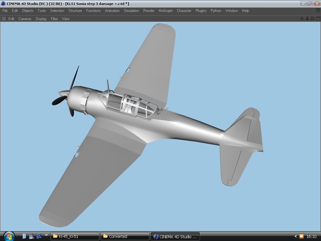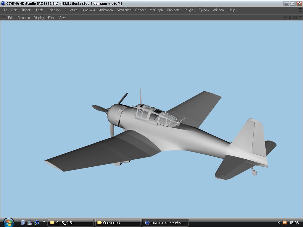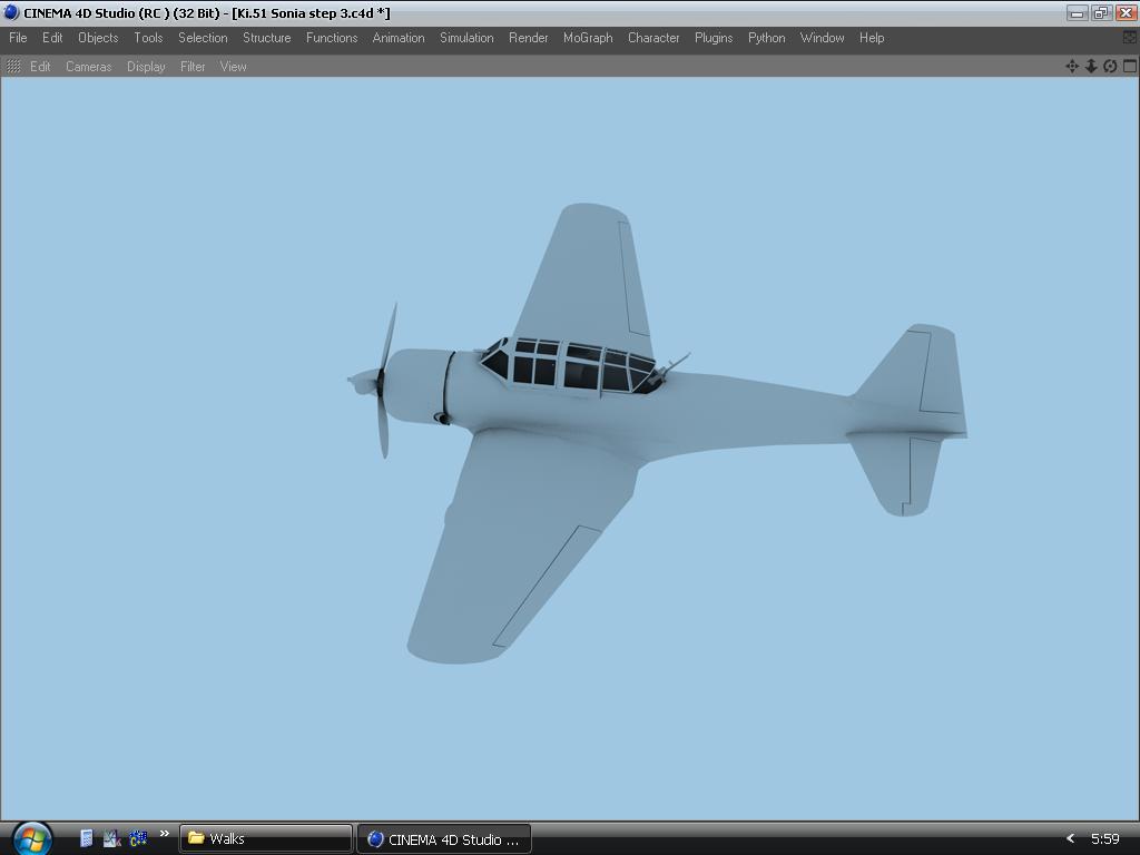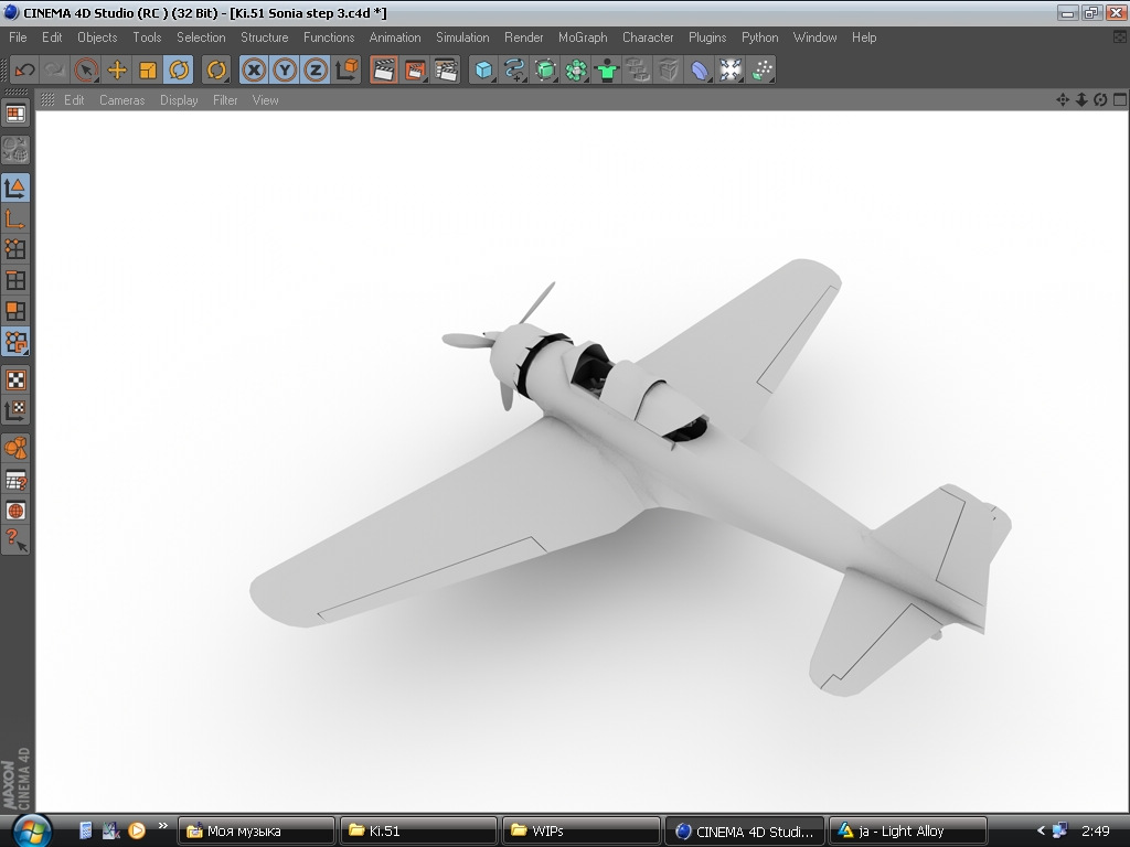 Делая крылья радиатора, обратил внимание на неверно сделаный моторный отсек. Переделываю. Заодно поправил пузо машине. Каждая сворка основного радиатора является независимым объектом с установкой оси Y таким образом, чтобы створка открывалась корректно ("как дверца")