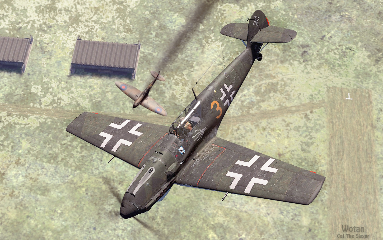 Bf109E-7/Z W.Nr5819 Major Adolf Galland. Машина на которой Галланд летал с осени 1940г вплоть до апреля 1941 года. Во время его отпуска, в начале 1941 года машина (изначально E-4/N) прошла модернизацию- получила возможность подвески доп. бака (Е-7), и систему GM-1. В конце апреля 1941 года машина была передана в "учебно-боевую" Erg.Gr. JG26