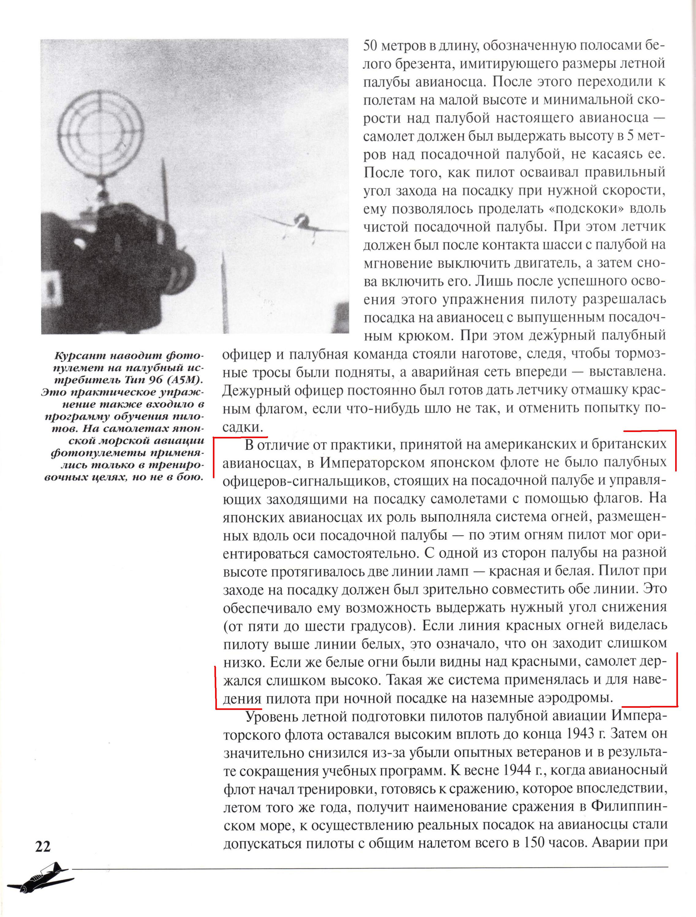 "При возвращении на авианосец пилот должен был получить от палубного офицера (Seibiin) световой сигнал разрешения на посадку, после чего он выполнял круг над авианосцем таким образом, чтобы оказаться примерно в 800 м за его кормой на высоте около 200 метров. После определения курса корабля и направления ветра (днём об этом можно было судить по струе пара, вырывавшегося из специальной трубы в носовой части корабля и по выполненной белой краской соответствующей разметке полётной палубы) пилот начинал заход на посадку под углом в 6,5 градуса относительно продольной оси корабля. В условиях плохой видимости и ночью для облегчения посадки служили сигнальные огни на белой линии вдоль продольной оси полётной палубы от носа до кормы. После приближения к авианосцу на расстояние в 200 м, на высоте в 50 м пилот выпускал посадочный гак и корректировал боковое отклонение машины, руководствуясь сигнальными огнями на кормовой рампе. Нахождение на посадочной глиссаде и выдерживание угла подхода в 6,5 градуса пилот определял по видимому им расположению красных и зелёных сигнальных огней — если они выстраивались в одну линию, то это свидетельствовало о том, что курс выдерживается правильный. " Ещё внизу на скрине страница из книги по морской авиации Японии. Понятно, что в игре огни не работают, но они же есть. Теоретически, какие огни с какими должны "выстраиваться в одну линию"? А может их можно сделать светящимися? У паровоза же сделали горящую фару.