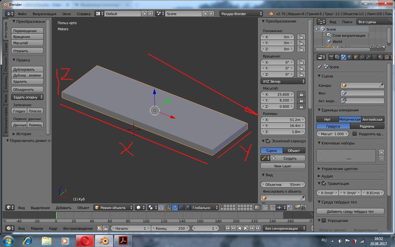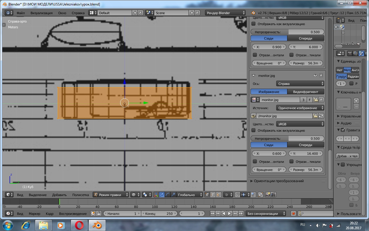 Вообще Блендер я знаю плохо... Хорошо если треть или четверть его возможностей... По этому всё, что я здесь напишу это скорее наблюдения и размышления, но никак не уроки. Работаю в Блендере 2.76. Английский знаю плохо ну точнее не знаю) по этому сразу блендер русифицировал, мне так удобнее. Пользуюсь бленди-экспортером (Большое спасибо Coldman), который является переписанным адд-оном под 2.7 с версии 2.49.https://drive.google.com/open?id=0B4...y1NWUlEdFJFMXcСтарая версия под, Блендер 2.49 SAS Текстуры рисую в Гимп 2.8. То есть всё программное обеспечение в свободном доступе и бесплатное. Хочу создать модель монитора "Железняков" для Ил-2. 1. С чего начинается создание мода? Правильно с поиска информации, в частности нормальных чертежей. Спасибо коллегам по форуму, чертежи нашлись. Очень могут помочь сканы бумажных моделей, пара часов работы в Гимп-е и можно собрать отличный теоретический чертеж корпуса. Да и в работе с надстройками бумажная модель тоже поможет. 2. Определяемся с размерами модели, у "Железнякова" Д*Ш*О=51.2*8.2*0.88 м. Открываем Блендер, удаляем всё, что есть в окне вида, добавляем в сцену куб.(скр1.) В меню "сцена" в единицах измерения ставим метры. Жмем N на английской раскладкае клавиатуры, и в выпадающем меню преобразований видим размеры нашего куба, сторона куба равна двум метрам. (скр2.) Меняем размеры куба, длинна по х, ширина у. Мы не знаем высоты надводного борта, но знаем осадку, задаём осадку по оси z, потом подгоним высоту борта по чертежу. В итоге у нас есть основные размеры корпуса в метрах. 3. Размещаем чертёж. Для нормальной работы нужны вид сверху, снизу, сбоку, плюс теоретический чертеж корпуса. В выпадающем меню справа (кнопка N) внизу есть вкладка "фоновые изображения". Ставим галочку, жмакаем добавить изображение-открыть. Открываем изображение. (скр3.) В меню "вид" выбираем вид "сзади" этот вид соответствует виду с левого борта, почему так, не знаю. В "фоновых изображения тоже выбираем вид сзади. Открываем изображение нужного чертежа. Включаем прозрачность (кнопка Z), (скр4.) масштабируем и перемещаем изображение, до нужного результата. И так по всем видам, поперечные срезы теоретического чертежа помещаем на виде спереди. Пока вот так, если что не ясно задавайте вопросы, постараюсь ответить. Тo be continued. Последний раз редактировалось tvister; 08.09.2018 в 03:48. |