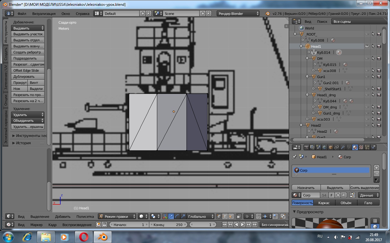 И вот почему, бленди-экспортёр изначально не экспортирует материалы. Мы можем назначить материалы определённым полигонам, блендер позволяет использовать несколько материалов на одном объекте, но свойства материалов не экспортируются. ОГРОМНЫЙ минус. Материалы приходится подбирать из стандартных материалов Ил-а. Текстурирование имеет те же принципы, что и в Максе. В режиме редактирования, создаём UV развертку. Нарезаем будущие объекты с помощью команды выделить шов (см скрин3). Делим экран на две части на одной половине открываем редактор UV изображений в котором разворачиваем созданные развертки, на другой работаем с объектом. (скрин1). Мелкокалиберное вооружение и модели экипажа, я делаю отдельными моделями со своими материалами и текстурами, пригодится в других проектах(скрин2). Смесь лени, острого недостатка времени помноженное на отсутствие таланта художника, сподвигли меня на злобный плагиат . Конечно если бы знать авторов Смоленска и Индианаполиса, если бы была возможность спросить разрешения на использование их работы... Но все мои усилия по их поиску прошли даром. Если Красный Крым нарисовал сам, то в проекте Бруклин во всю использовал скин Индианаполиса. Все равно получилось лучше, чем рисовал бы сам. Проект Железняков не стал исключением, за основу был взят скин Смоленска и полностью переработан под Железняков. Если воспользовался скином Смоленска, грешно не позаимствовать и его вооружение. То есть выполнить импорт сторонних моделей в Блендер. Но об этом в следующем посте.