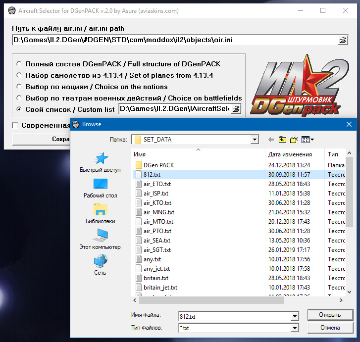 В IL-2_4-13-4m_DGen_pack_2_1_UPD есть AircraftSelector.exe Вопрос: В данной проге есть возможность использовать "Свой список самолетов". 1-е Как его составить? 2-е Как его использовать? Просьба растолковать как для особо одаренного. С уважением |