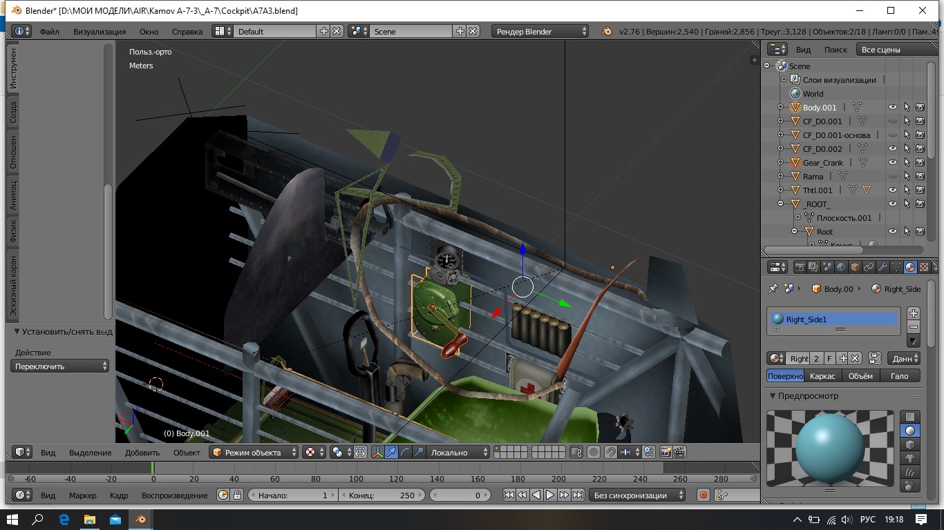Отчет по работе с кокпитом. Пока занимаюсь "базой", неподвижными, не анимированными частями. Если по индикаторам работы мотора и полета, есть какая то информация, то по органам управления нет ничего, кроме ручки и педалей. Компоновка кабины то же не известна. Есть фото с снятыми панелями правого борта, где четко виден какой то баллон. Больше никакой информации. Придется что то фантазировать. Не смотря на то, что кабину собираю по чертежам (из МК) кабина почему то получается "тесной". Задняя часть пулемета буквально упирается в "лицо-камеру".