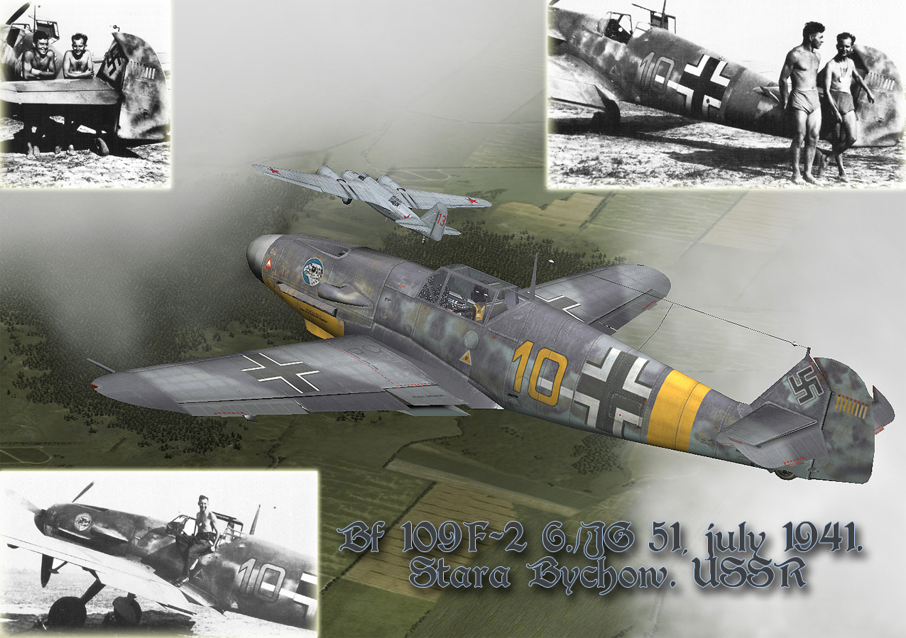 http://aviaskins.com/downloadskin.aspx?id=1047&lang=en Машина, запечатлённая со всего левого борта на кинохронике при возвращении после 300-301 победы и фрагментами на нескольких фото. Кстати, на растиражированной по книгам фото, с подписью типа «Желтая-1 Хартманна, садится после 300-й победы», где трое мужичков на земле, возле вымпела 9-го штафеля, машут подлетающему к ним мессеру- фикция, ибо по кинохронике видно, что на машине Хартманна, кок окрашен в спираль, а не с треугольником напротив лопасти как на той фото. Или фикция кинохроника, где и лючок на носу откинут.