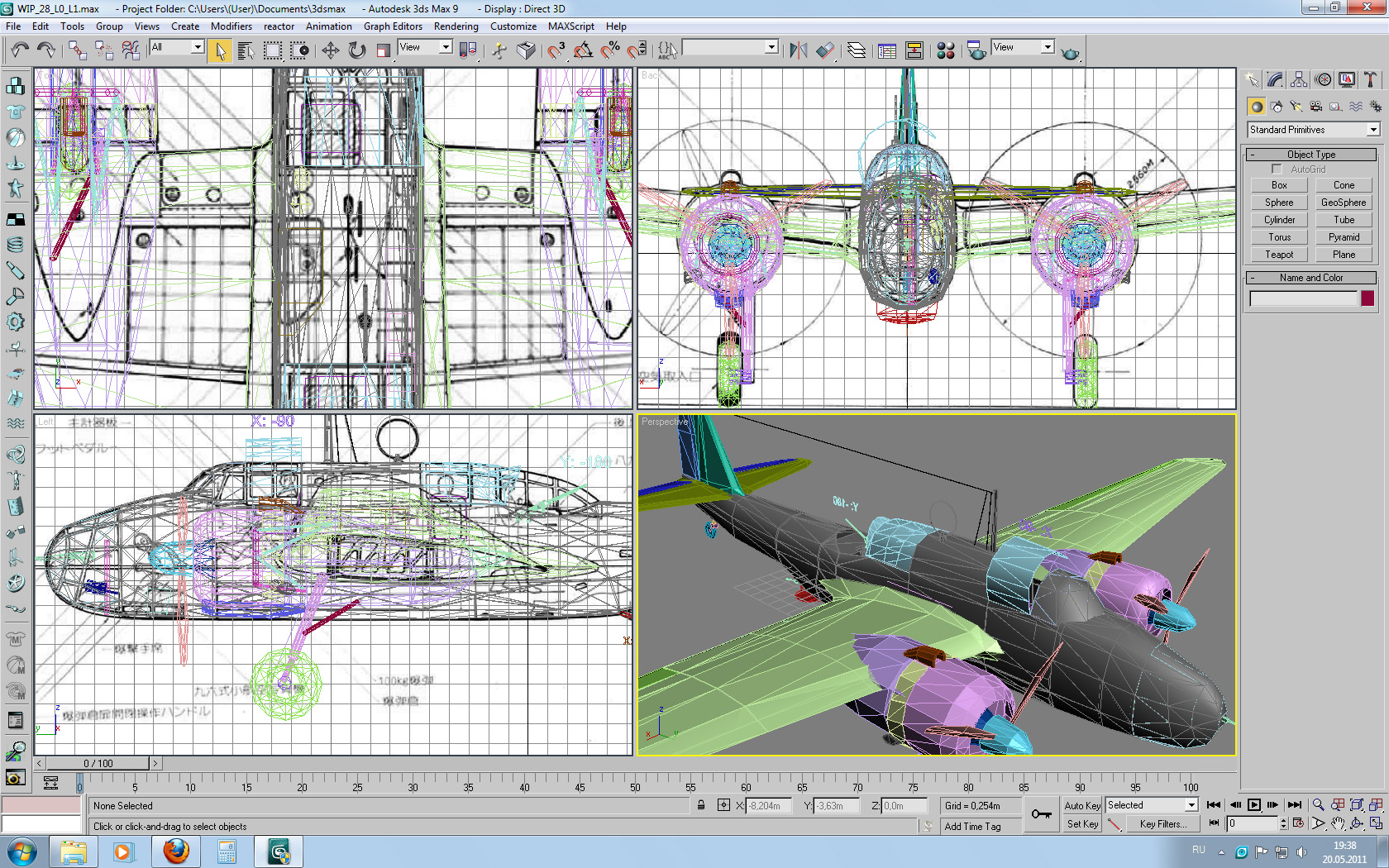 Я делаю так: 1)Создаем квадратную картинку любого удобного размера. 2)режем исходный чертеж на вид слева/справа, сверху, спереди/сзади. 3)Тех квадратных картинок создаем столько, сколько проекций. 4)В фотошопе, или другой аналогичной программе, совмещаем изображения так, чтобы на всех видах центр их осей был одинаково расположен в центре квадратных картинок. 5) сохраняем все виды, а для удобства делаем их фон не белым, а светло-серым. 6)В максе, делаем активным окно проекции, идем в Views-->Viewport Background, выбираем там соответсвующую картинку, ставим галку Match Bitmap, Lock Zoom/Pan. Кстати весь процесс описан в Help-->tutorials... Там как раз про моделирование самолета. Там написано (если дружите с языком Байрона и Шекспира ) как подогнать картинки по размеру. То есть, делаем бокс, пишем ему максимальные размеры самолета, и по нему все картинки приводим. Если надо, могу наглядно пояснить суть метода. Удачи! П.С. выглядит в конце все так как на картинке: