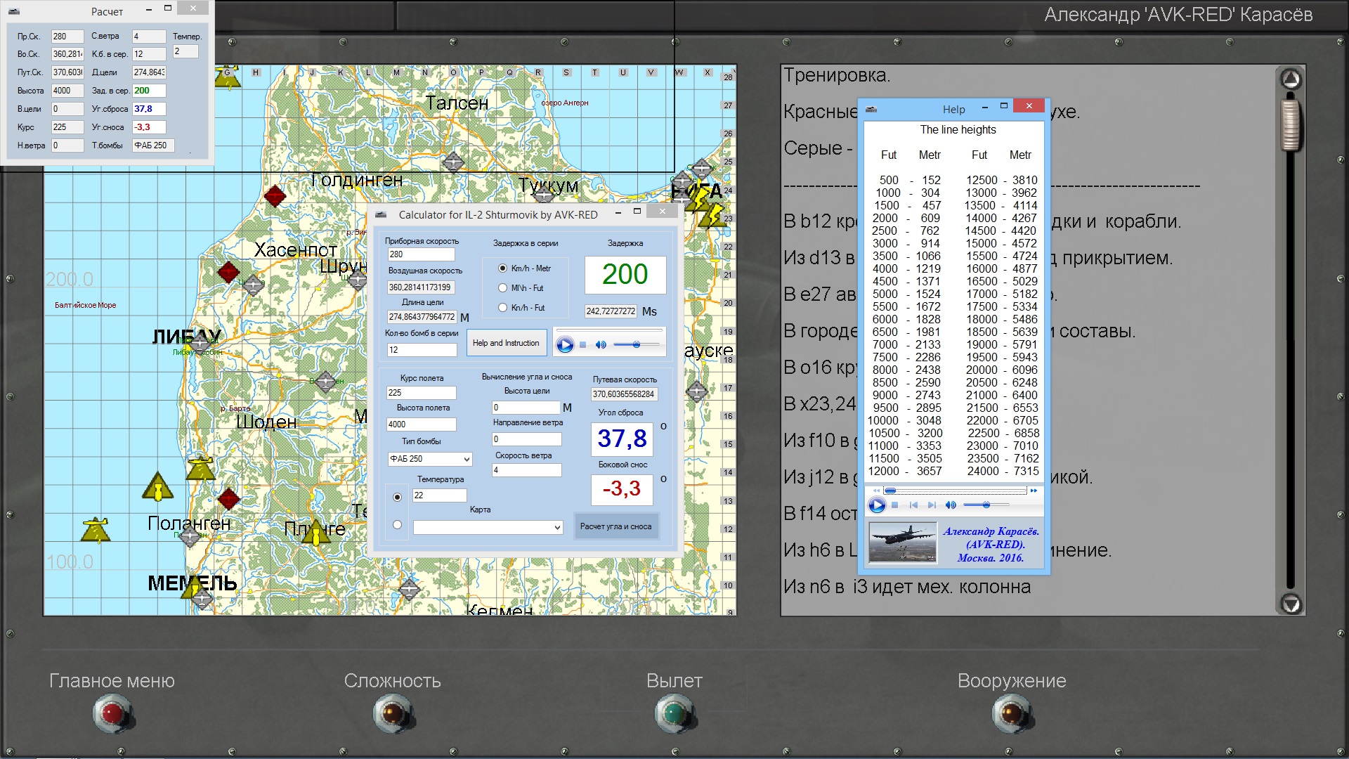 В версии 4.13 введён серийный сброс бомб. Но им пока никто почти не пользуется. Во первых никто из картоделов не указывает длину цели. Во вторых в русских самолетах отсутствует интервалометр, хотя задержка при серийном сбросе между бомбами присутствует.... Странно... Я заглянув в будущее написал маленькую прогу, которая вычисляет угол сброса, сноса, длину цели и задержку в серии. https://yadi.sk/d/PbA7_E6e32wwiG Видеоурок https://www.youtube.com/watch?v=s2JKqk4Ia9A