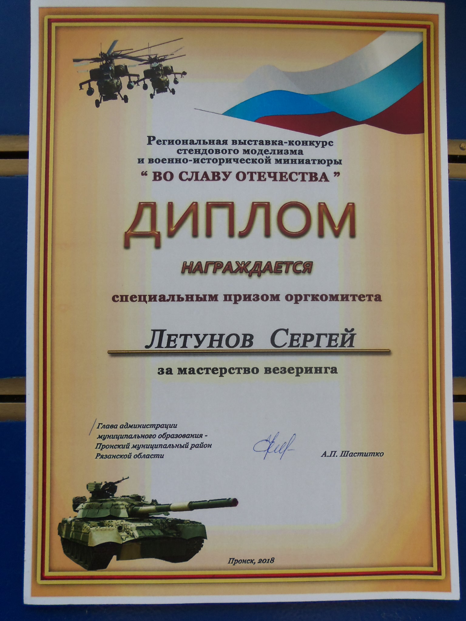 От СЮТ трое участников и мой друг из Ангарска. Итог по юниорам: Елисафенко Павел 1 место в номинации Военная техника других стран в 1-35. Данкин Илья - специальный диплом. У меня тоже 1 место за шарика.