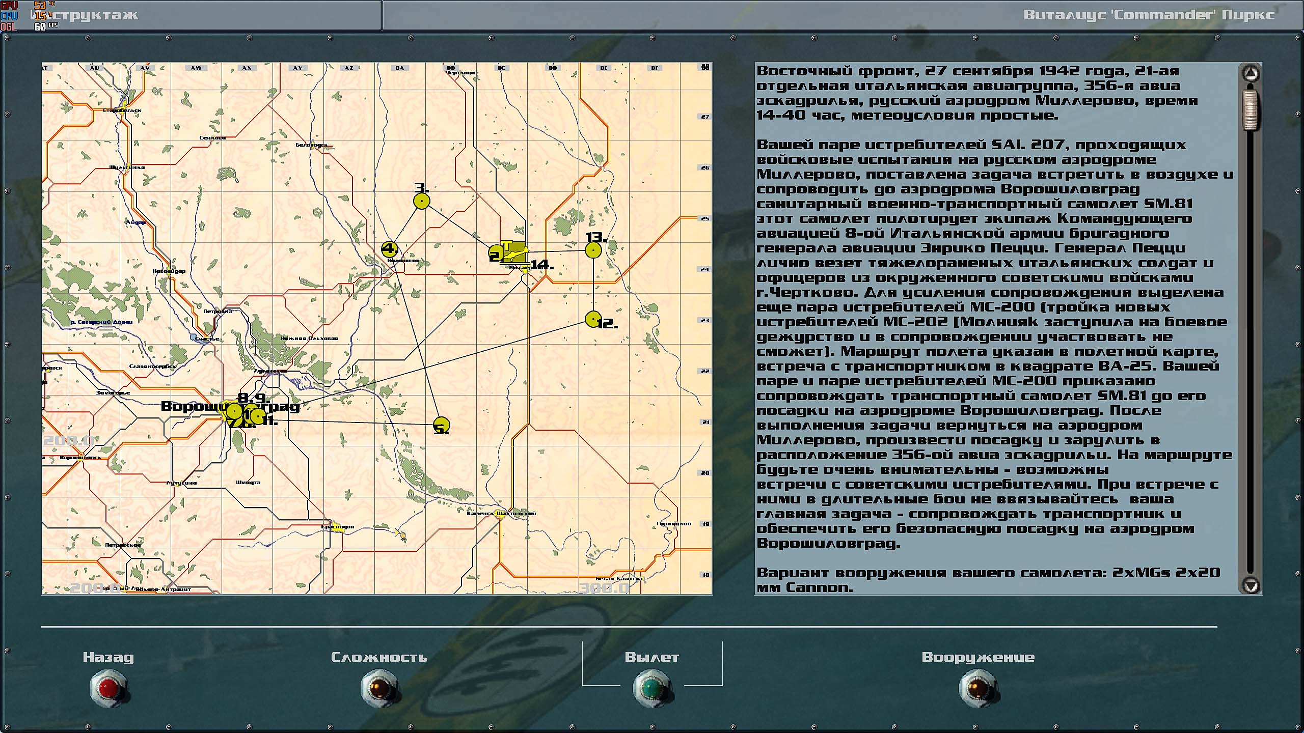 Миссия посвящена воинскому подвигу, совершенному нашим противником – итальянским бригадным генералом авиации Энрико Пецци (1897 – 1942 г.г.). С 25 февраля 1942 года и до своей гибели 29 декабря 1942 года Энрико Пецци был Командующим авиацией 8-ой Итальянской армии в России (ARMIR). В декабре 1942 года советские войска в составе Юго-Западного и Воронежского фронтов начали операцию по окружению войск 8-ой итальянской армии. Так, под городом Чертково, была окружена 14-ти тысячная группировка итало-немецких войск (группировкой командовал немецкий полковник Голлер). Для обеспечения обороны группировки итальянские военно-транспортные самолеты SM.81 и итальянские бомбардировщики BR-20M снабжали ее боеприпасами, продовольствием, медикаментами, ГСМ и вывозили в тыл раненых солдат и офицеров. В конце декабря 1942 г советские войска вплотную подошли к г.Чертково и артиллерией начали обстреливать военный аэродром города. После этого посадку на аэродром начали производить только легкие немецкие самолеты «Шторьх», а тяжелые итальянские транспортные самолеты SM.81 и бомбардировщики BR-20M сбрасывали свои грузы с воздуха. 29 декабря 1942 г лично Командующий итальянской авиацией в России бригадный генерал авиации Энрико Пецци и его экипаж, пилотируя санитарный самолет SM.81 (регистрационный номер 20257) посадил его на аэродром Чертково, выгрузил военные грузы, загрузил 20 человек тяжело раненых итальянских солдат и офицеров и под артиллерийским огнем, без истребительного сопровождения, вылетел в направлении на аэродром Ворошиловград (ныне Луганск). Но в Ворошиловград этот самолет не прибыл. Уже после войны, предположительно было установлено, что тяжелый итальянский транспортный самолет упал в 4-х км к северо-востоку от села Югановка (примерно в 42 км от г.Миллерово) – все, находящиеся на борту самолета, погибли. На борту самолета находился и начальник итальянского военного госпиталя в Ворошиловграде полковник Федерико Боккети – у него была трудная задача – отобрать из многих десятков раненых всего 20 человек (все понимали, что этот санитарный рейс последний и все остальные раненые, в лучшем случае, окажутся в советском плену). Бригадный генерал авиации Энрико Пецци в Италии посмертно был награжден Золотой медалью за воинскую доблесть. Моя миссию относится к жанру альтернативной истории со смещенными временными рамками и местом действия. Она является продолжением предыдущей миссии «Истребитель SAI. 207», ее сюжет такой – в конце сентября 1942 года вашей паре истребителей SAI. 207, проходящих войсковые испытания на русском аэродроме Миллерово поставлена задача встретить в воздухе и сопроводить до аэродрома Ворошиловград санитарный военно-транспортный самолет SM.81 – этот самолет пилотирует экипаж Командующего авиацией 8-ой Итальянской армии бригадного генерала авиации Энрико Пецци. Текст брифинга миссии «Бригадный генерал авиации Энрико Пецци»: Восточный фронт, 27 сентября 1942 года, 21-ая отдельная итальянская авиагруппа, 356-я авиа эскадрилья, русский аэродром Миллерово, время 14-40 час, метеоусловия простые. Вашей паре истребителей SAI. 207, проходящих войсковые испытания на русском аэродроме Миллерово, поставлена задача встретить в воздухе и сопроводить до аэродрома Ворошиловград санитарный военно-транспортный самолет SM.81 – этот самолет пилотирует экипаж Командующего авиаци