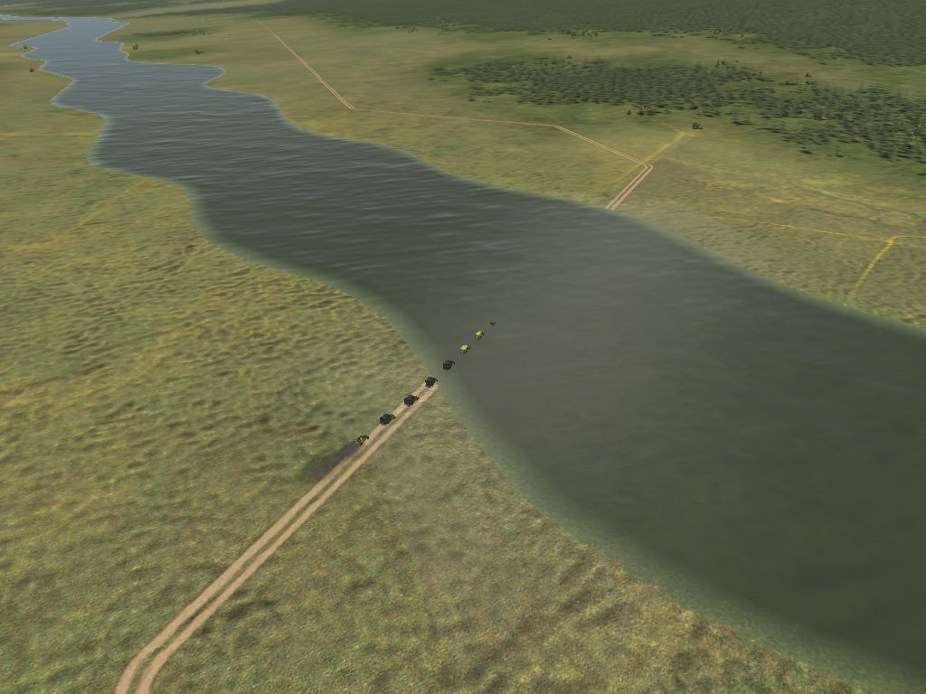 Тем не менее, транспортные средства свободно пересекают эти реки, что хорошо, потому что в таких местах были речные броды. Единственным недостатком является то, что броды не визуализируются в реках. Я попытался использовать подход мелкой воды, использовать мелкие кусочки текстуры SeaShore для серфинга, но не удалось. Есть ли какие-то идеи о том, как сделать броды видимыми с полетов, пожалуйста? |