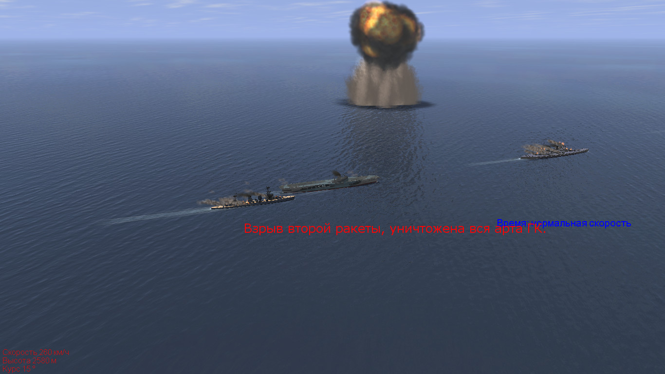 В итоге, что получилось, взрыв в радиусе пятисот метров уничтожит любой корабль, но чаще ракета рвется дальше. При первом взрыве, на линкорах и крейсерах, сносит всю мелкокалиберную арту, повреждает надстройки, уничтожает самолеты на палубах авианосцев. Второй взрыв, добивает всю башенную артиллерию. Третий вызывает пожары, четвертый как правило топит. Вообще все зависит от удаленности от эпицентра.