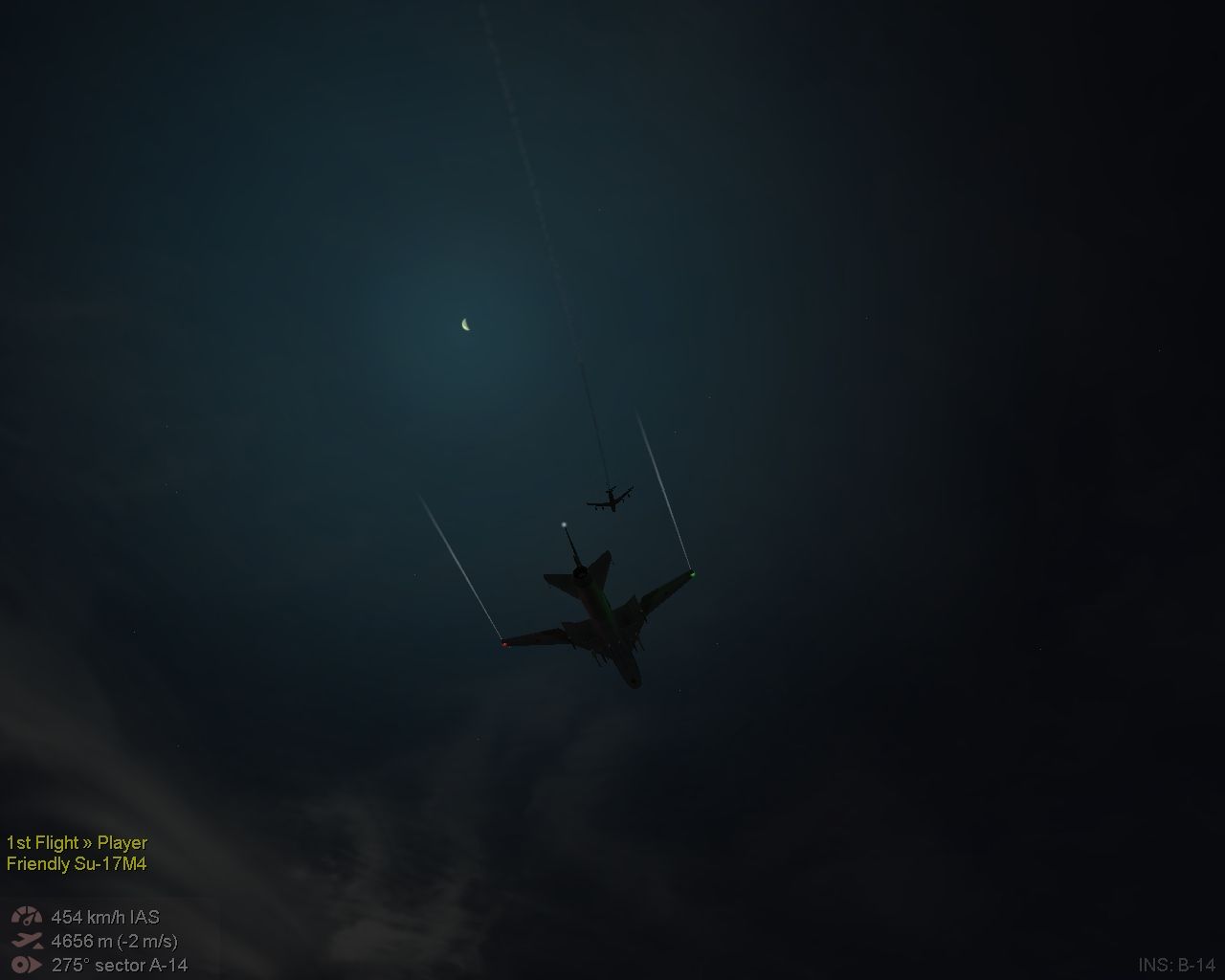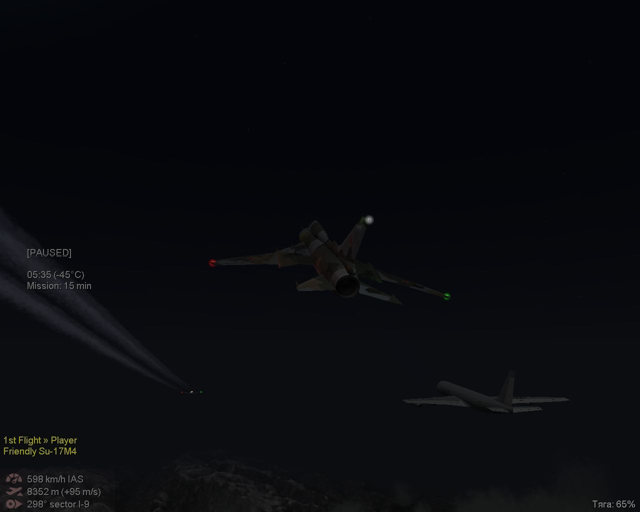 Насколько зрелищная была первая миссия - настолько захватила вторая! Но РЛС в районе Теберды я поставил, сам объект перехвата не смотрел. Интересно было посмотреть на это бешеное чудо, гонялся за ним долго, даже на сверхзвуке, ближе 5 км приблизиться не смог, и когда керосина осталось 20 процентов, выпустил Р-60. Посмотрел на витиеватое падение сбитого, и тогда глянул поближе! Очень классно!