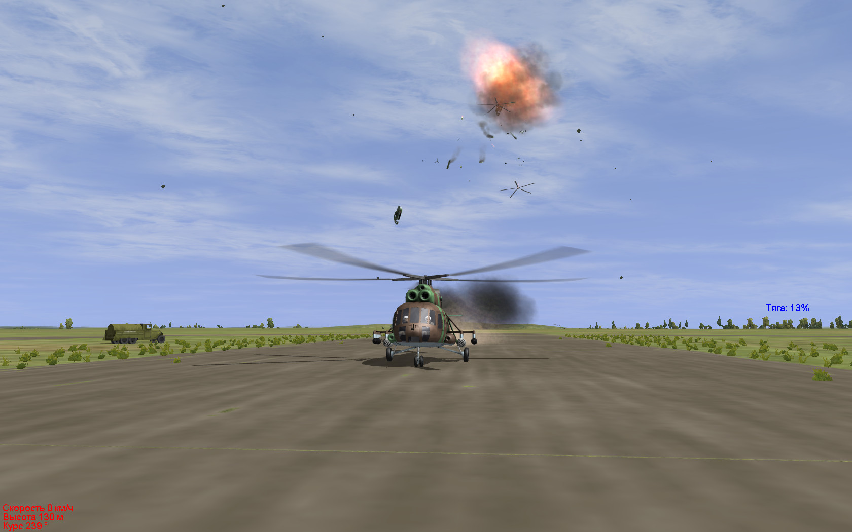 ми-8 все еще не летабелен. если берешь с собой пару ботов, то они либо вверх ногами зависают, либо бьются, с аи ботами та же беда. взлет на восьмерке лучше не стал. набор высоты - скорость 0км\ч, далее попытка лететь, нос отпущен, скорость 10км\ч, затем 30км\ч - мертвая петля через хвост, на выходе набор до 80 км\ч - снова валежка на хвост и земля. вывод - скорее всего у ми-8 беда с центровкой.