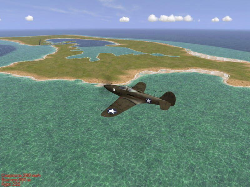 Прим.: полоса на острове Литтл Макин в целом сделана по историческому исходнику, однако скудность данных по данному аэродрому вынуждает делать допущения. Так, стоянки на аэродроме имеют общую емкость в полторы эскадрильи, хотя на полосе свободно базировалось, например, полное крыло ( три эскадрильи ) ВВС США на "Аэрокобрах". Длина полосы моделировалась по оригинальной карте атолла и в общем-то соответствует реальной, длина - порядка 2000 м, даже несколько больше, и хотя при японцах она была по всей видимости грунтовой, я сделал ее с покрытием из стальных плит, которое американские ВВС сразу укладывали на всех захваченых у японцев ВПП. Взлетный и посадочный курсы полосы соответстуют реальным. Полоса принимает все типы самолетов. Высота полотна - 0 м. Выезды на такси с западного торца и примерно с 1/4 от начала с восточного среза. Такси и стоянки - обычный грунт, поэтому не газуйте при рулении - скапотируете.