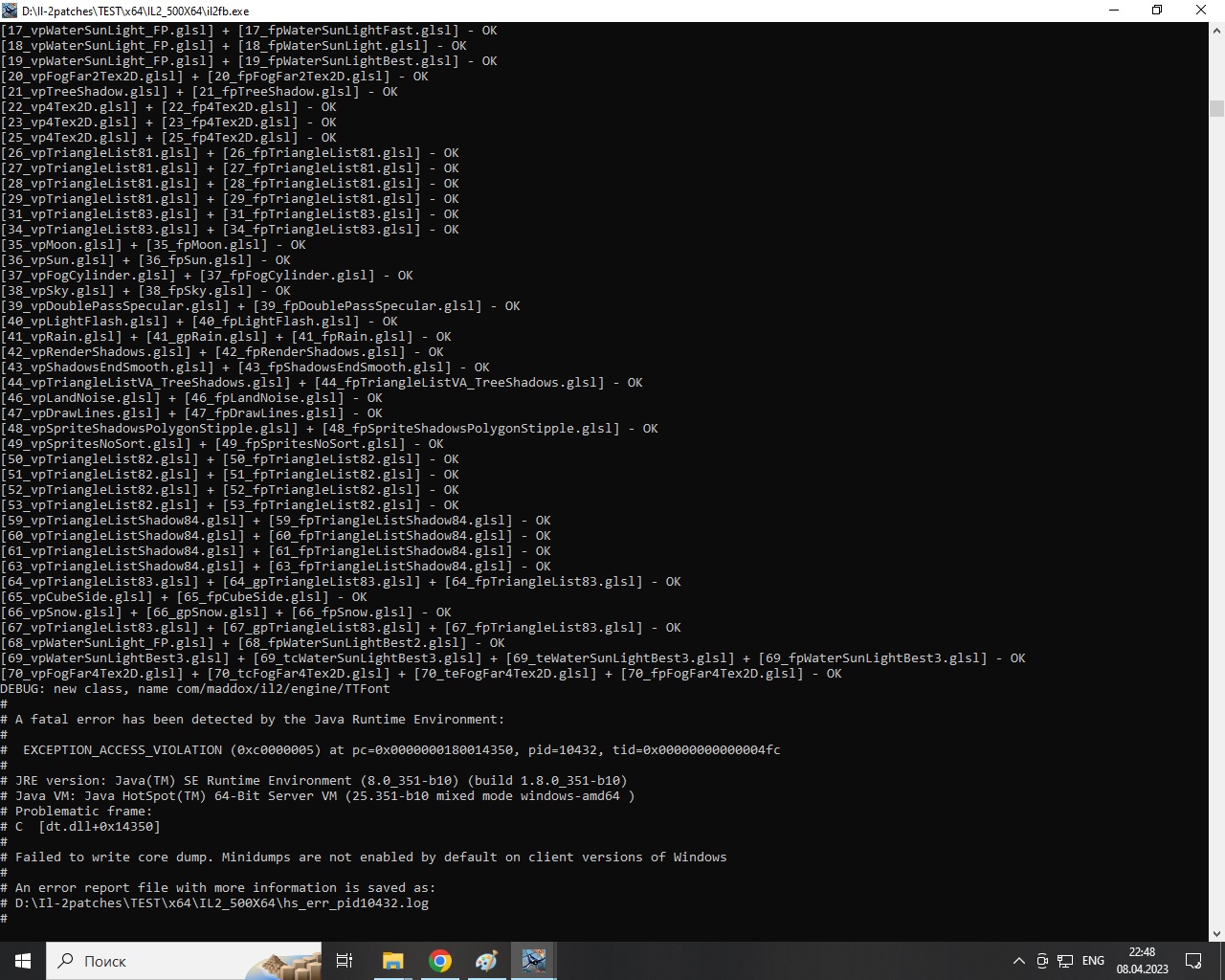Чтобы исключить возможные ошибки перезаписи и замены файлов в папке с игрой в процессе перехода от версии к следующей версии. Так-же скорее всего описанная ниже методика, снижает вероятность, "поломки" конфига игры. 1. Снес все папки с игрой 64 битной. 2. Начал с "чистого листа". Тоесть распаковал выложенную тут версию 2.0.9.8, обновил игру до версии 2.0.9.9 методом замены файлов в папке с игрой на файлы из обновления 2.0.9.9. 3. Проверяю на Вин 7, запуск норм, глюков нет, бурой пелены нет, гор непонятных нет Копирую на диск эту успешную папку как копию с названием IL2_500X64_2.0.9.9_GOOD и больше пока не трогаю эту папку !!!!!!!!!!! эту папку потом буду проверять в Вин 8.1 4. Обновляю версию 2.0.9.9 до версии 2.1.0.3 методом замены файлов в папке с игрой на файлы из обновления 2.1.0.3 Проверяю на Вин 7, запуск норм, глюков нет, бурой пелены нет, гор непонятных нет Копирую на диск эту успешную папку как копию с названием IL2_500X64_2.1.0.3_GOOD и больше пока не трогаю эту папку !!!!!!!!!!! эту папку потом буду проверять в Вин 8.1 5. Обновляю версию 2.1.0.3 до версии 2.1.0.4 методом замены файлов в папке с игрой на файлы из обновления 2.1.0.4 Проверяю на Вин 7, запуск норм, глюков нет, бурой пелены нет, гор непонятных нет Копирую на диск эту успешную папку как копию с названием IL2_500X64_2.1.0.4_GOOD и больше пока не трогаю эту папку !!!!!!!!!!! эту папку потом буду проверять в Вин 8.1 6. Обновляю версию 2.1.0.4 до версии 2.1.0.5 методом замены файлов в папке с игрой на файлы из обновления 2.1.0.5 Проверяю на Вин 7, запуск норм, глюков нет, бурой пелены нет, гор непонятных нет Копирую на диск эту успешную папку как копию с названием IL2_500X64_2.1.0.5_GOOD и больше пока не трогаю эту папку !!!!!!!!!!! эту папку потом буду проверять в Вин 8. 7. Обновляю версию 2.1.0.5 до версии 2.1.0.6 методом замены файлов в папке с игрой на файлы из обновления 2.1.0.6 Проверяю на Вин 7, запуск норм, глюков нет, бурой пелены нет, гор непонятных нет Копирую на диск эту успешную папку как копию с названием IL2_500X64_2.1.0.6_GOOD и больше пока не трогаю эту папку !!!!!!!!!!! эту папку потом буду проверять в Вин 8.1 Вполне возможно, ранее при появление глюков под Вин 7, возникали ошибки и обновлении до следубщ версий или возникали ошибки в конфиге игры после закрытия игры, так как игра вроде при закрытии что то там проверяет и записывает в конфиг параметры по умолчанию в том числе и внастройках графики. , если ей что-то непонравилось в предыдущую сессию игры. ............................. Перезагружаюсь в Вин 8.1, проверяю систему на ошибки, запускаю всевозможные проверки доступные из под системы и назначаемые при следующей перезагрузке. Проверяю обновления для Вин 8.1, они отсутствуют на сегодня. Видеодрайвер 456.71 NVIDIA этой же верии стоит на Вин 7 UAC отключен Браундмаузер отключен Встроенный защитник Windows отключен(отключена проверка файлов в режиме реал времени) Файл il2fb.exe записан во всевозможные исключения для проверок Проверяю последовательно все папки отдельные с разными версиями игры, которые я создавал из успешных запущенных версий на Вин7 на предмет запуска игры и работоспособности. Пройдя по всем папкам с разными версиями игры не добился ни успешного запуска игры, ну и соотвественно ни о какой проверке работоспособности игры речь не идет. Основной текст в выводимых сообщениях об ошибках выглядит примерно вот так: Имя модуля с ошибкой: dt.dll Версия модуля с ошибкой: 1.5.0.5 (тут может быть версия другая) Перезагрузки проводимые в про