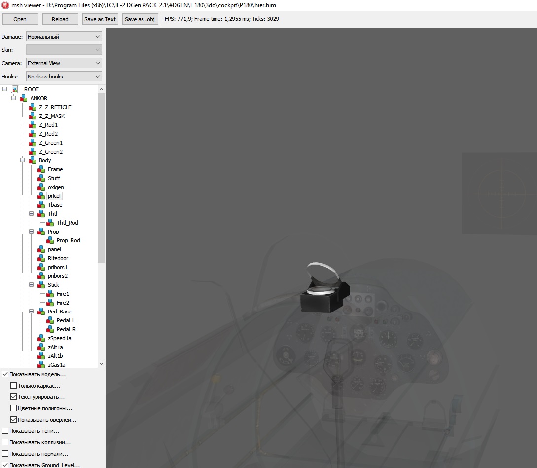 Он отдельным мешем у него, но вот в тех кабинах, что я выдернул из Ила, козырьки вместе с кабиной смоделины...без 3D-программы не обойтись. |