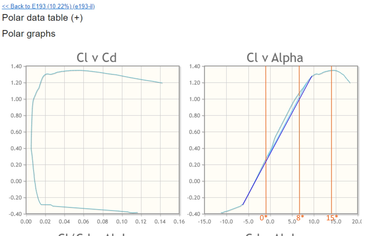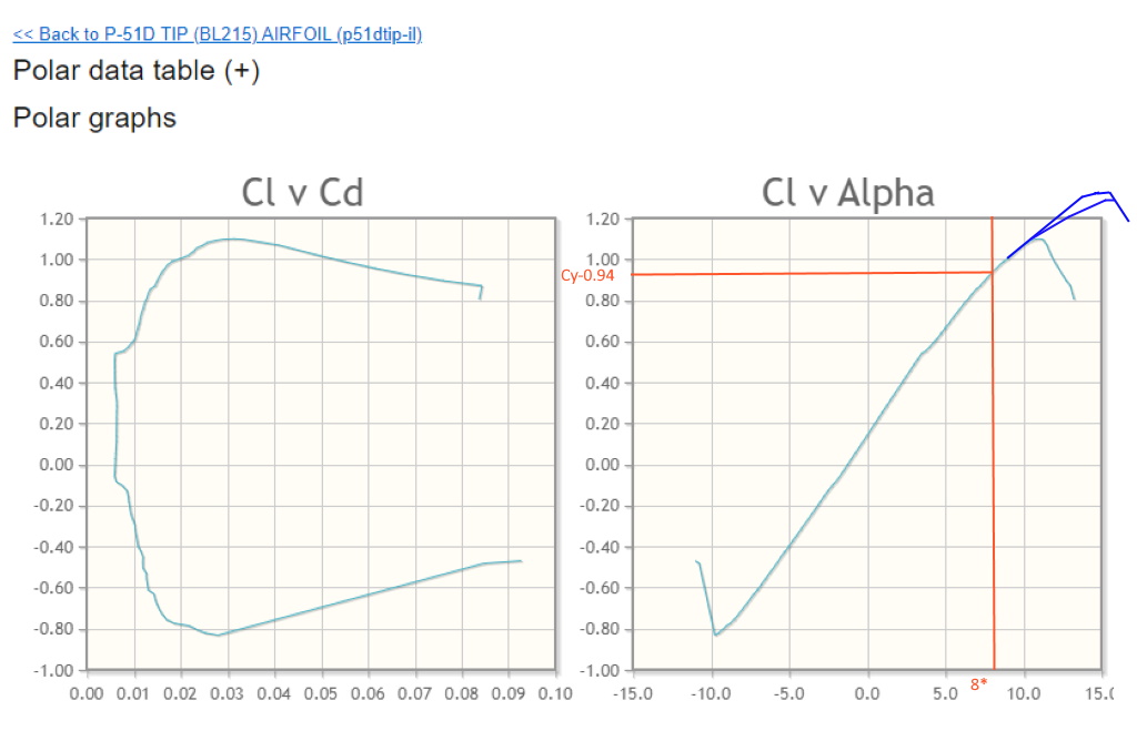 Переписывал поляру несколько раз - в тесте не то получалось. Графика продувки целого самолёта у нас нет. Есть продувка крыла XP-51(картинка ниже с каляками прикида) и графики из аир-фойл, которые пытался сопоставить: http://airfoiltools.com/airfoil/deta...oil=p51dtip-il http://airfoiltools.com/polar/detail...tip-il-1000000 http://airfoiltools.com/polar/detail...a05-il-1000000 http://airfoiltools.com/polar/detail...415-il-1000000 Читал: https://ww2aircraft.net/forum/thread...f-p-51d.54306/ https://ww2aircraft.net/forum/thread.../#post-1207807 По аир-фойл для Мустанга на графике очень маленькое Cy max - 1.1. Думаю, что конструкторы Мустанга не стали б заморачиваться с хитрыми методами улучшения профиля НАСА 65(2)-415(?), если бы в результате понизилось Cy max от исходного. Поэтому в поляре поставил наибольшее Cy max - 1.35. Остальное - это наложение графиков профилей из аир-фойл на график продувки крыла XP-51. Код: