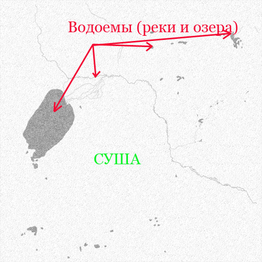 Я сделал побережье, собрался уже тебе отсылать .... и тут понял чего не хватает на map_C. Меня смущает полное отсутствие рек и озер на map_C. Даже на карте Кенигсберга на Map_C отсутствуют реки и озера. Я догадываюсь, что они сделаны "накладными", хотя на "иловских" картах именно файл map_c.tga для этого и предназначен. Я попытаюсь через день -два отослать тебе его уже с готовыми озерами и реками. Думаю это будет лучше чем делать водоемы "накладными"... Насколько я понял сам map_R.tga отвечает за т.с. отражения на воде. Он имеет альфа-канал, размер его 512 на 512 пиикселей. По своим контурам это копия суша/земля. На рисунке ниже я показываю его образец в альфа-канале на своей карте. Пока не заморачивайся им- мы им займемся в самом конце. |
