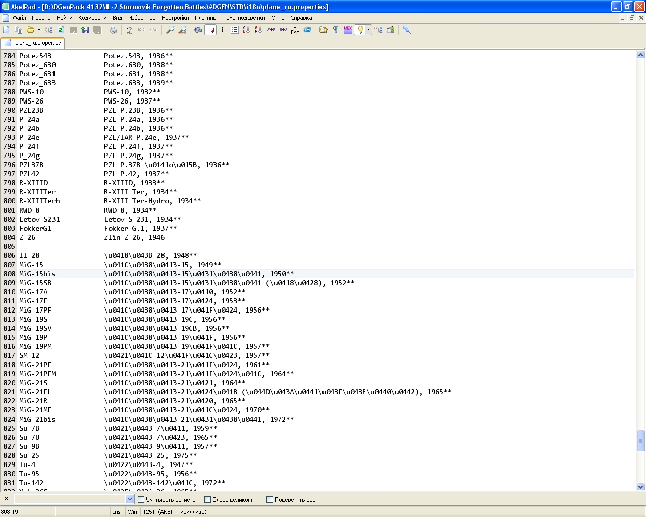 У меня в обоих этих файлах МиГ-15бис без скобок, при этом в окне выбора все по-русски. Скриншоты прилагаю.