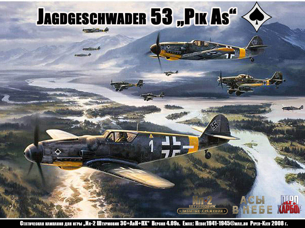 Крайняя, из имеющихся у меня кампаний Сергея Милославского (Piper-Kiev) – она называется «JG 53 Pik As» и посвящена немецким летчикам-истребителям, воевавшим в составе авиаэскадры JG-53 на Восточном фронте, в Тунисе, Италии и Венгрии с 1941 по 1945 г.г. Кампания имеет две версии - для V 4.09 и для V 4.10, эти версии немного отличаются друг от друга и имеют разные скинпаки, но обе эти версии хорошо идут в V 4.13.3. Скинпаки обеих версий кампании выставлены в общей папке на файлообменнике – ссылка http://www.fayloobmennik.net/6941221 пароль JG53