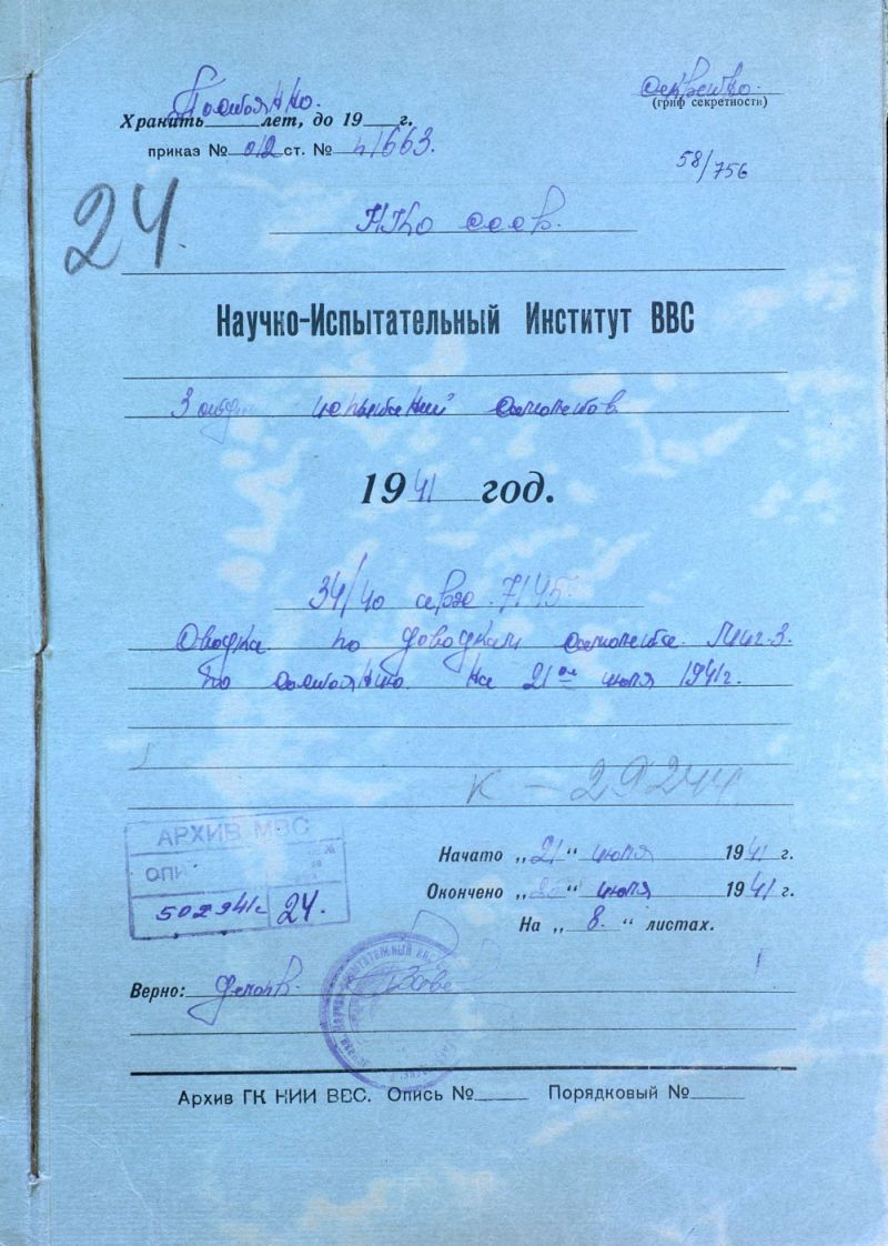 "НИИ ВВС. Сводка по доводкам самолёта МИГ-3 по состоянию на 21-ое июля 1941года"